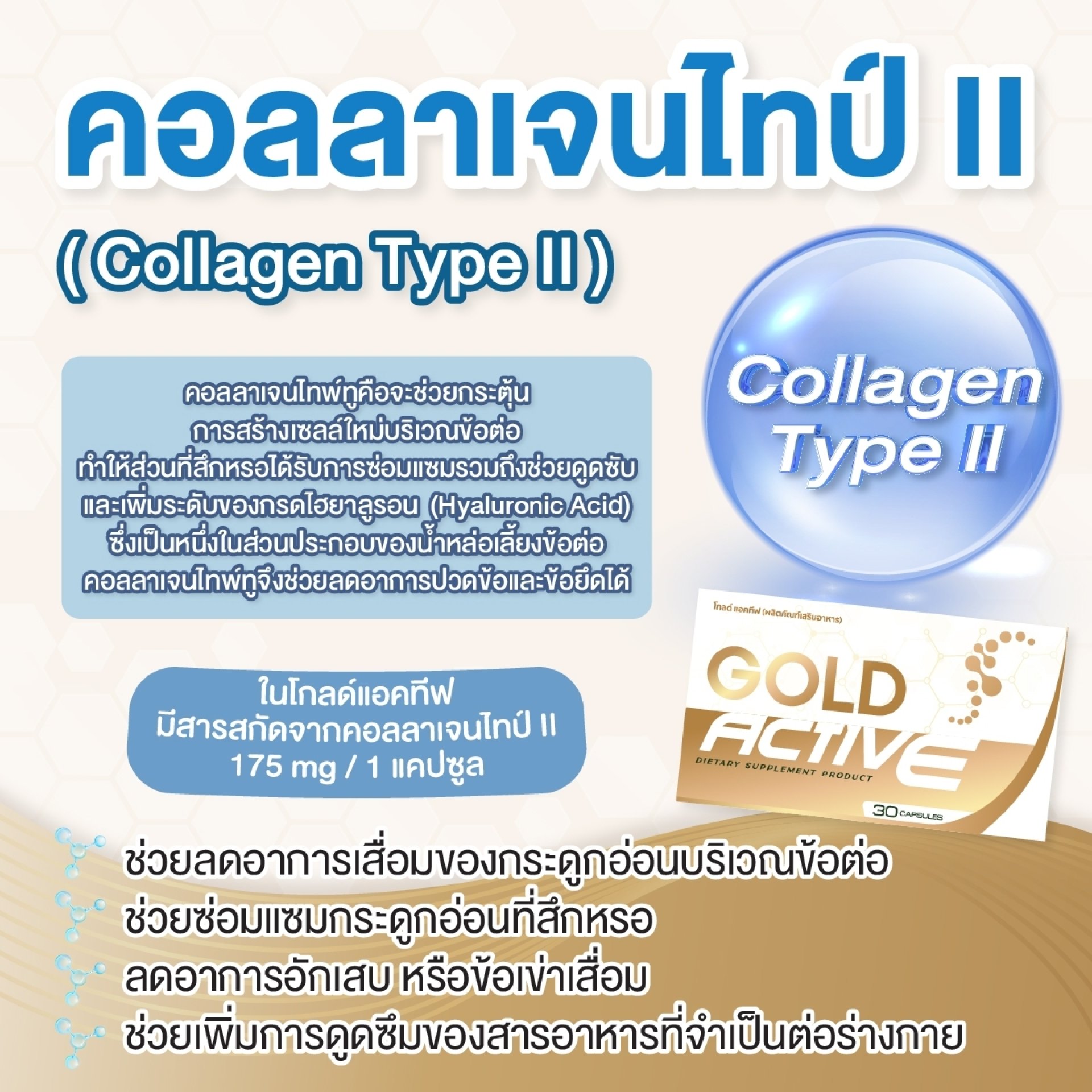 จุดเด่นของคอลลาเจนไทพ์ทู คือจะช่วยกระตุ้นการสร้างเซลล์ใหม่บริเวณข้อต่อ ทำให้ส่วนที่สึกหรอได้รับการซ่อมแซมรวมถึงช่วยดูดซับและเพิ่มระดับของกรดไฮยาลูรอนิค (Hyaluronic Acid) ซึ่งเป็นหนึ่งในส่วนประกอบของน้ำหล่อเลี้ยงข้อต่อ คอลลาเจนไทพ์ทูจึงช่วยลดอาการปวดข้อและข้อยึดได้